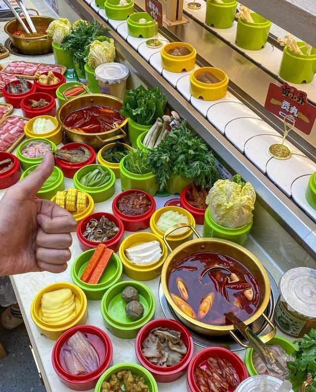 旋转小火锅本质上就是小锅取代大锅,一人一锅,自取菜品,传送带转着送过来。起步于2010年代后期,2018年左右在深圳、成都等地冒头,那时候经济还行,年轻人爱追新鲜事儿。
