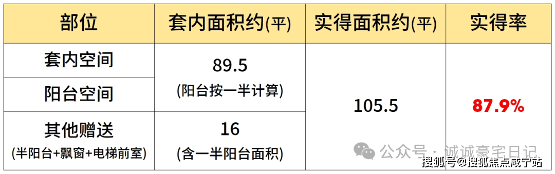 该户型大量的飘窗+双阳台设计,保证了每个功能间的通风采光,也提升了户型的实得率。经过专业建筑师测算,假设阳台全部封闭的情况下,项目建面约120㎡户型实得面积约105.5㎡,实得率约88%。(该实得率数据根据实得面积预估计算所得,仅供参考,不作为置业依据。最终得房率以购房合同为准)