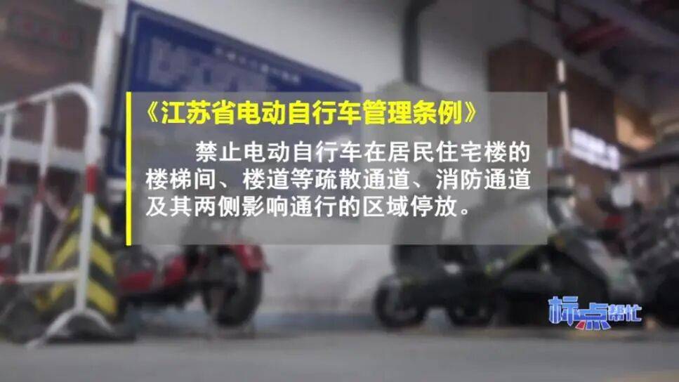 《江苏省电动自行车管理条例》明确要求:禁止电动自行车在居民住宅楼的楼梯间、楼道等疏散通道、消防通道及其两侧影响通行的区域停放。