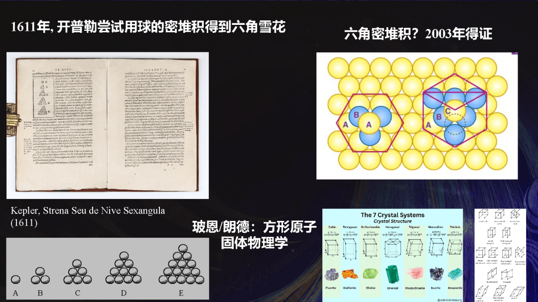 用球不仅是堆出一般的物质,甚至在1611年,伟大的开普勒就试图用球堆积出六角雪花的形状来研究这个问题。他在堆积过程中发现总是有五边形的空,将来会引出所谓的准晶研究,所以说你看开普勒是非常了不起的。当然等到1910年前后,我们研究固体的导热、研究固体的导电的时候,玻恩和朗德甚至提出了正四面体原子和正方体原子的概念。其实说什么呢?其实就是固体的几何的原子,这我们学固体物理就知道了,不讲了。我们往下。