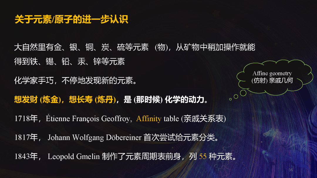 有了电以后,人类研究就加速了。后来人们发现了更多元素以后,当个体足够多,人们就会发现它们中间或远或近有不同的亲戚关系。这就有一个关于亲戚关系的研究,我们管它叫亲和性 affinity。其实 affinity 这个词,不管在化学、在物理、在数学里面,到处都有研究点之间那种亲戚关系。我们汉语随便把 affine geometry 翻译成仿射数学或仿射几何,什么意思天知道。它其实就是研究亲戚关系。到1817年的时候有人就尝试给元素分类。到1843年的时候有人都能列出55种元素了。有了50多种元素,人们就注意到有一些规律。