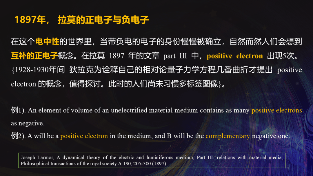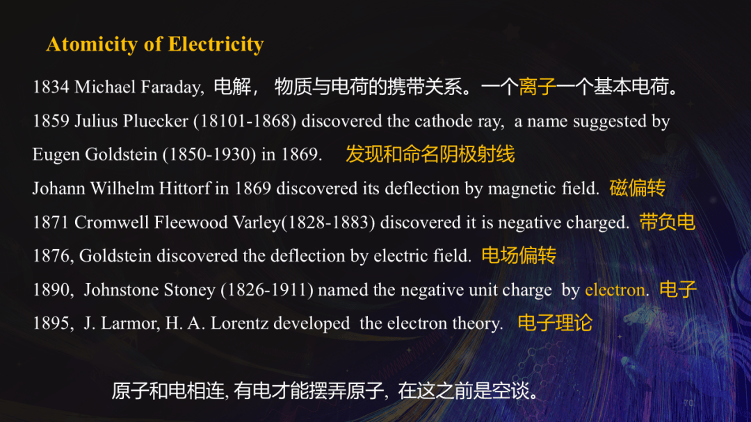 1890年的时候呢,Stoney觉得这个东西可能应该叫电子,就起了个名字叫电子,有了电子以后,荷兰人洛伦兹,英国人拉莫尔就发展了关于电子的理论。他们的电子理论里面有些是正确的,但大部分是错的。但是我提醒大家一句,我们相当多的书里面是不分对错就都给拿过来了。