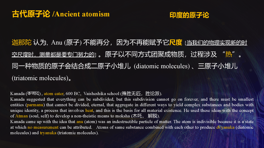 我觉得这一点可能没引起重视,而这位印度的智者,当年对物质的认识应该很深入。因为那个时候的印度语里面就出现了两个原子凑成了一小堆儿、三原子凑成了一小堆儿这样的一些词,就是两原子分子、三原子分子,在古印度的文献里就已经有了。