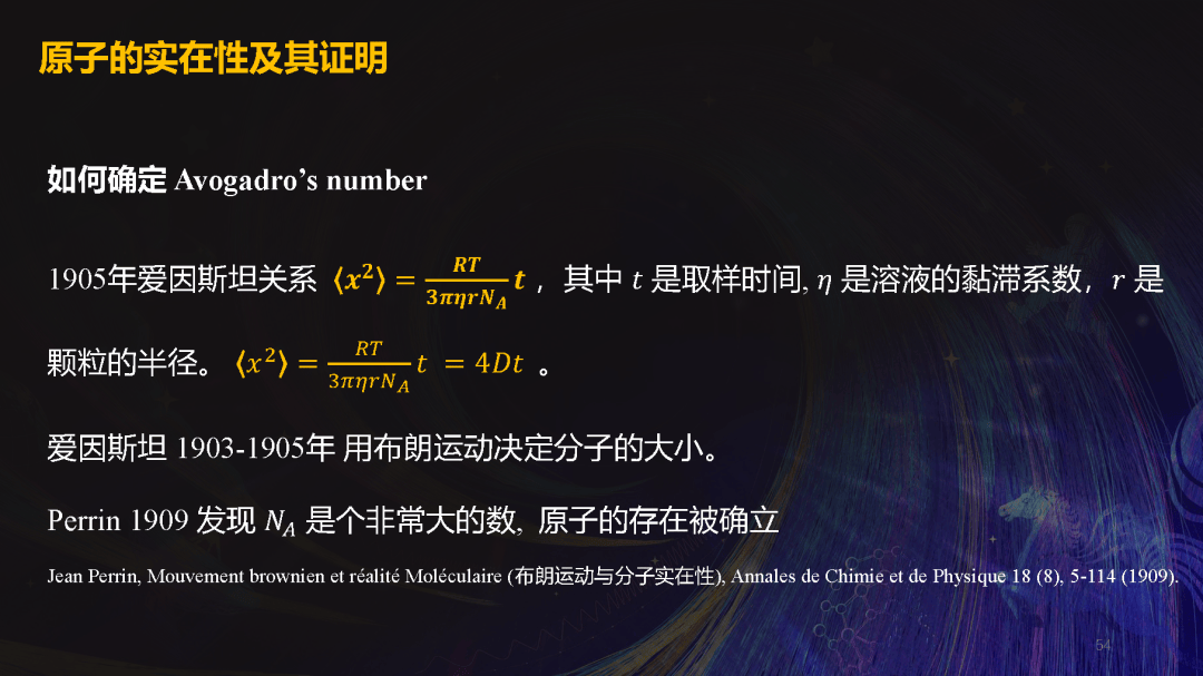 后来有很多不同的方法,特别注意又是爱因斯坦。爱因斯坦就在这个方向做了工作,而且得出了非常重要的公式,就是粘滞系数和扩散率之间的关系,这是非常了不起的爱因斯坦关系。都在爱因斯坦1905年成名之前,所以说爱因斯坦真是随便哪个工作都足以确定一个人作为大科学家的地位。