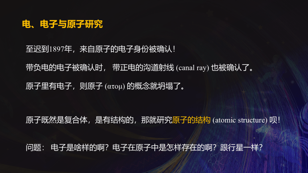 现在刚才都是一些关于原子粗略的研究。我们还有另外一个重要的研究原子的工具,就是电。很早我们知道摩擦生电。到1831年的时候,法拉第给我们演示了感应生电,因此我们就不再需要仅靠化学电池供电,而可以有持续供电。这就使得用电来研究电本身、用电来研究物质性质成为可能。有了电的研究以后,首先一个重要的认识是:竟然发现电这个东西本身是有最小单位的,表现出原子性或量子性。电子就成了原子的一个组成部分。但是电子因为可以被电来操控,那就好玩多了。所以电子的有趣度、知识风度,我甚至觉得它虽然是原子的组成部分,但它的有趣度或者知识风度高于原子。关于原子本身,你写一本书也不够。我是前前两年在物理学会专场有专门一个报告,叫《电子的独特物理角色》,就专门讲电子的,网上有。