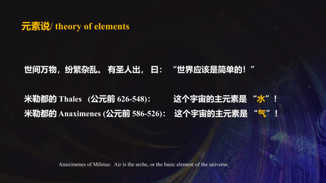 从一开始,人们从朦胧状态醒来,看到世间有很多事物,结果某一天有个圣人说,世界应该是简单的。那么在古希腊公元前六七世纪的时候,有人说这个元素的主元素是水,还有人说这个宇宙的主元素是气。