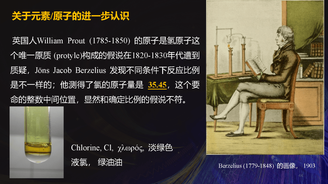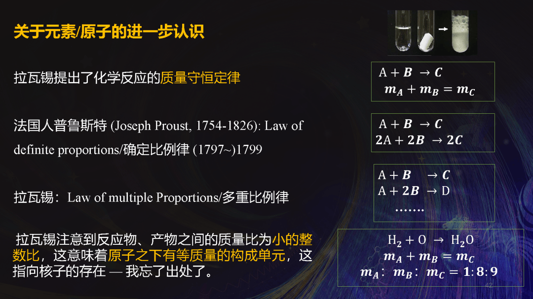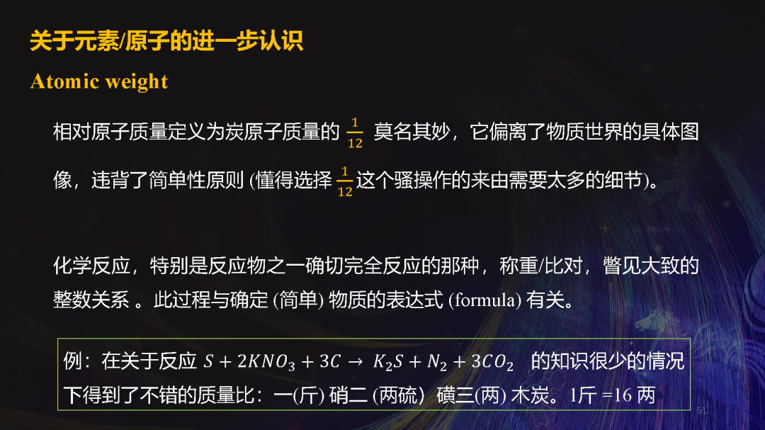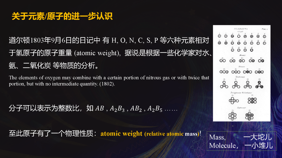 他那时候已经有所谓的氢、氧、氮、碳、硫、磷这种元素相对于氢原子的原子重量,并且认识到元素之间可以用不同的原子比产生新的物质。这个时候原子除了刚才说的有大小、有钩子,还有另外一个非常重要的物理概念:有重量,原子重,或者叫原子的相对质量,我们现在就说原子相对质量。