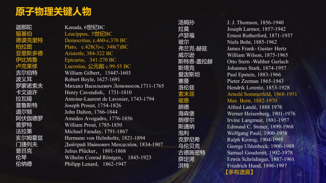 这里面有一些特别著名的人物,你都是要知道的,比方说德谟克利特,像卡文迪许、道尔顿,法拉第,提出元素周期表的门捷列夫,当然还有卢瑟福与波尔,最重要的是后面这两个用黄色字体标出的内容写的是索墨菲和波恩。