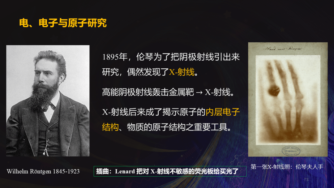 结果这位Lenard可能是大老板比较有钱,他把某种荧光材料,一种对X射线不敏感的荧光板全给买光了。结果伦琴也想研究这个东西,也把阴极射线从小孔里引出来,可是这种荧光板买不着了,他就去买另外一种板。没想到这这种板竟然对阴极射线打到阳极上,产生的X射线敏感。因为那个光很弱,所以说大家想一下,都是大半夜做实验,还得把实验室窗帘拉上啊,结果伦琴教授买的这种感光板呢,不光对电子束感光,对X线也感光。结果在他的装置和墙上靠着一块大板之间,他第一次看见了自己的肋骨。大家想这多吓人,大半夜做实验看见自己肋骨。