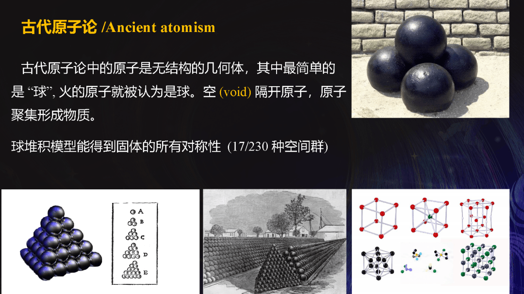 我们大家知道就行了:古代就认为原子仅仅是球状的原子在一起堆积,它就能够形成物质。没想到这么简单的一个模型,就是球加上中间有点空隙的堆积,实际上真的就能够堆积出我们的物质的不同结构。这个大家学固体物理都知道。将来用这个球、两个球中间插个棍儿的那样一个叫球棍模型,就能堆出所有固体的对称性。