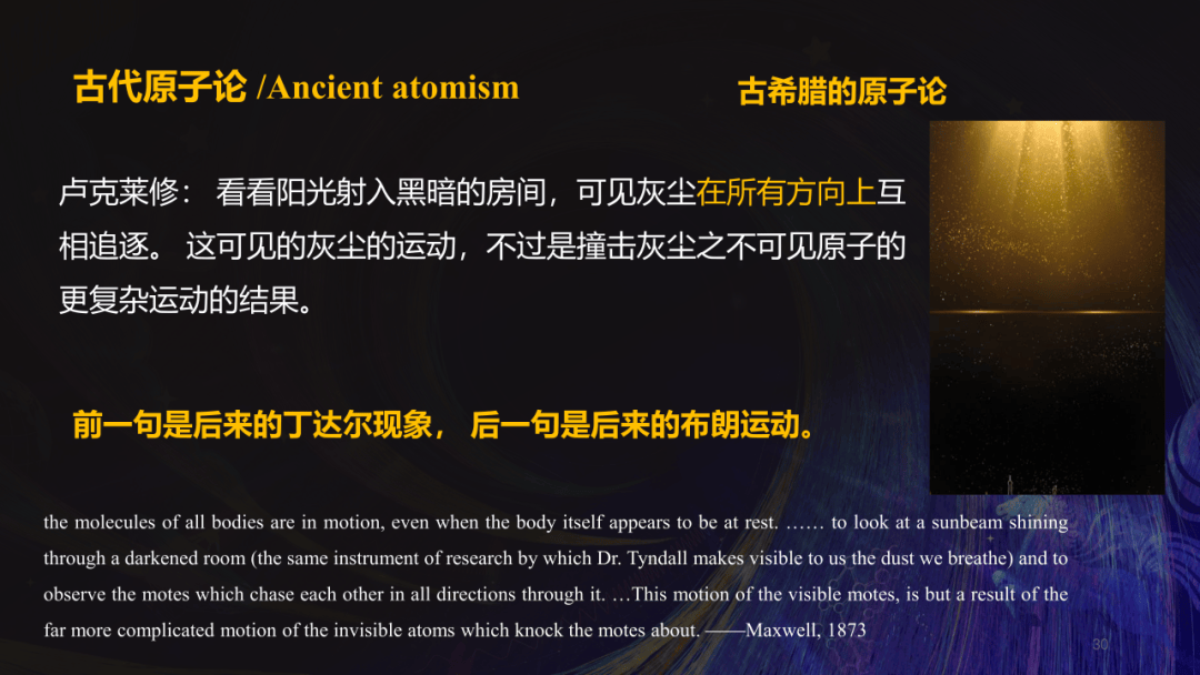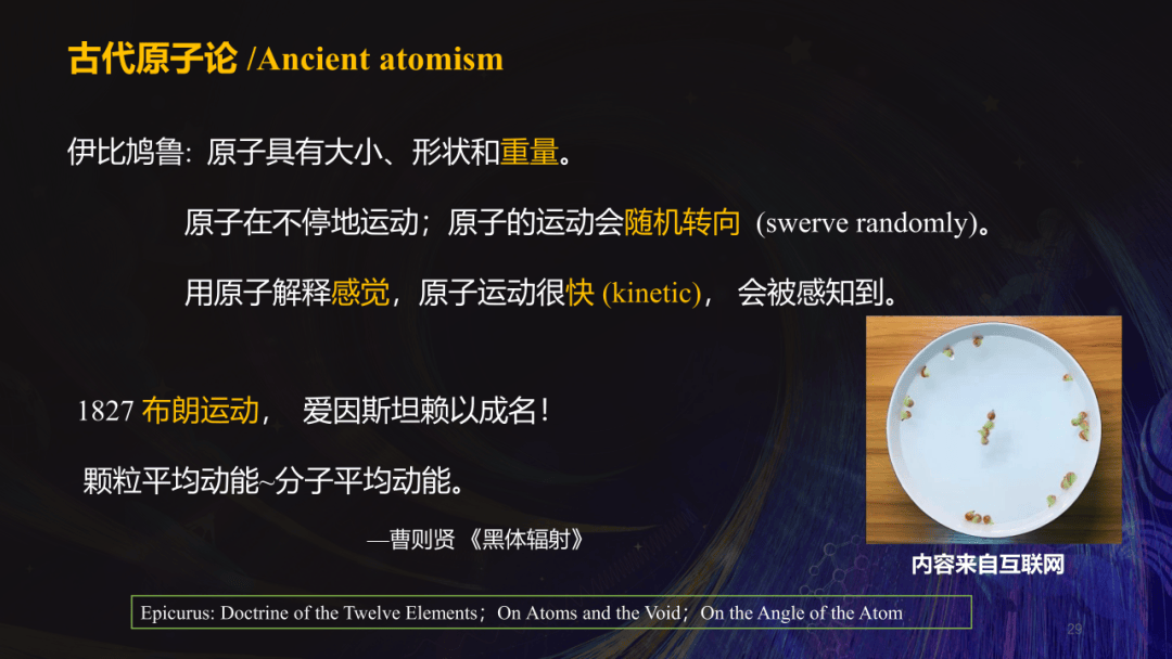 那么到伊壁鸠鲁呢?他对原子认识又往前一步,认为原子不光有大小,还可以有别的性质,比方说有重量,因为大家知道,原子构成物质,物质宏观世界有重量是吧?所以说他认为还有重量。他认为原子不停运动,但他提出一个重要词:不停随机的运动。运动过程中会转向,而且很多原子作用到人身体上,我们能感觉到存在对吧,比方用粉尘撒身上,可能就感觉到啊这概念非常有意思。就是大量原子运动让我们宏观上能感知。
