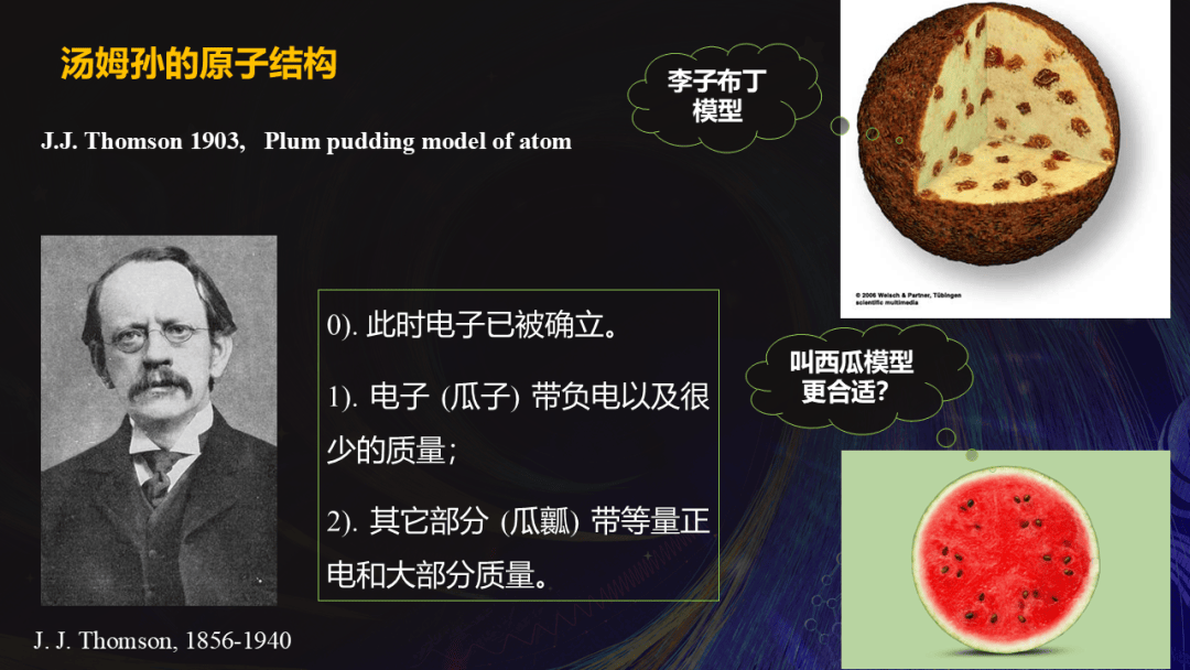 我不知道英国的布丁这个样子好不好?我总觉得咱们的西瓜模型可能更好一点,是吧?瓜子是带负电的电子,嵌在一个整质量的瓜瓤上面,对吧?我觉得西瓜模型可能更好。
