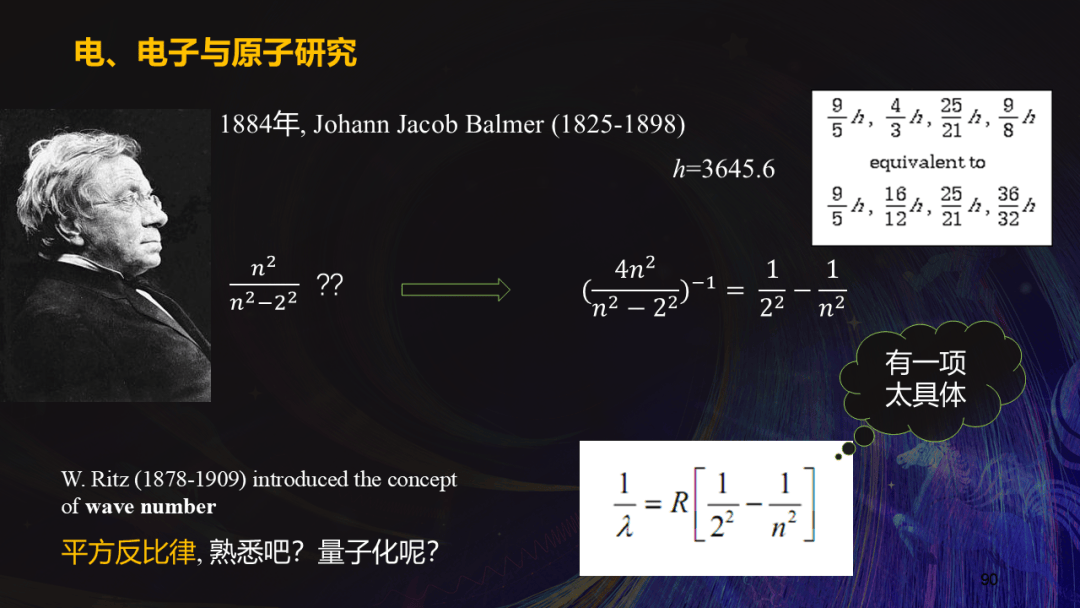 结果呢,还发现在氢的放电灯里面真的找到了别的谱线,尤其是红外那个部分,叫爬行线系,真找着了。这就有意思了。原子的发光竟然和一个公式,n,m是整数这样的一个简单的公式联系到一起了。