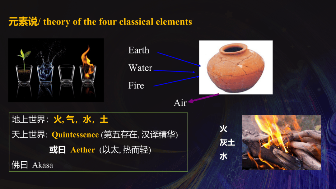 这个陶罐故事解释了在我们的这个世俗生活中的四种元素。可是抬眼还有天上。那么天上的物质是什么?不知道。既然地上是4种元素,天上我们就管它叫第五种元素,Quinta Essentia,拉丁语的第五存在。现在我们动辄翻译成精华素是胡说八道,第五存在就很准确。或者用另一个名字叫以太,这个词在化学里面的化学也是这个词,指轻飘飘的物质。佛教用语里叫阿卡沙。地上的世界是四种元素,天上的世界是轻飘飘的第五存在。
