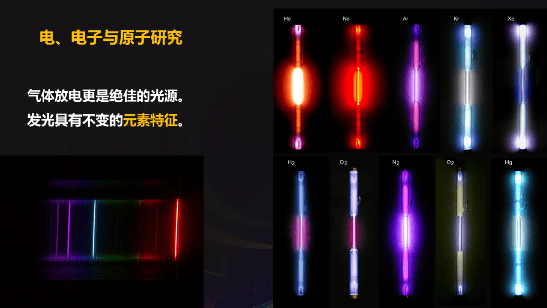 现在我们有好多纯的气体放电灯,就更容易去研究原子发光。其实啊,大家看我们研究这个过程,刚才的玻璃管,我们抽真空,出现发光(现象)。我们先把它当光源用,现在呢,又做成这个研究里面物质发光的光源。我们还注意到,里面的物质不同,光的颜色是不一样的,加上一个玻璃棱镜会得到不同的谱线。
