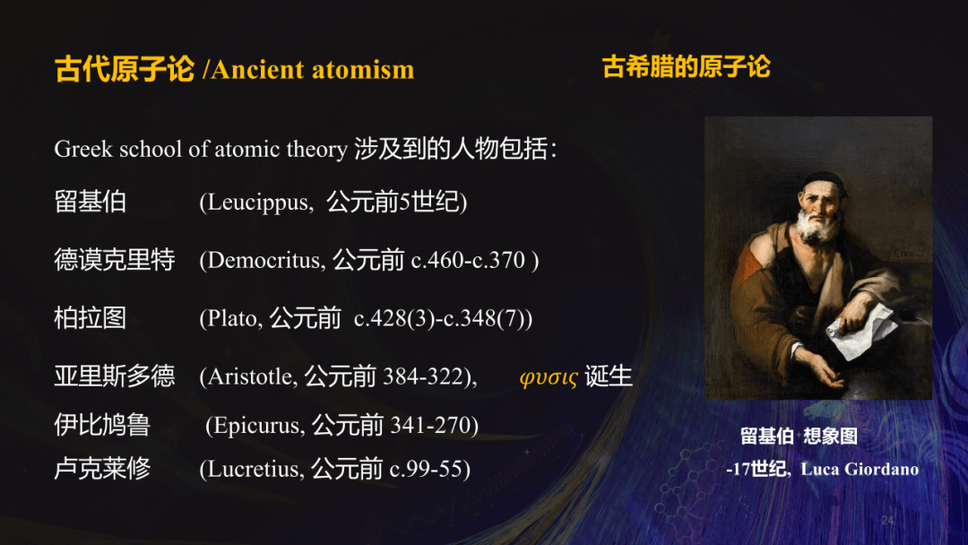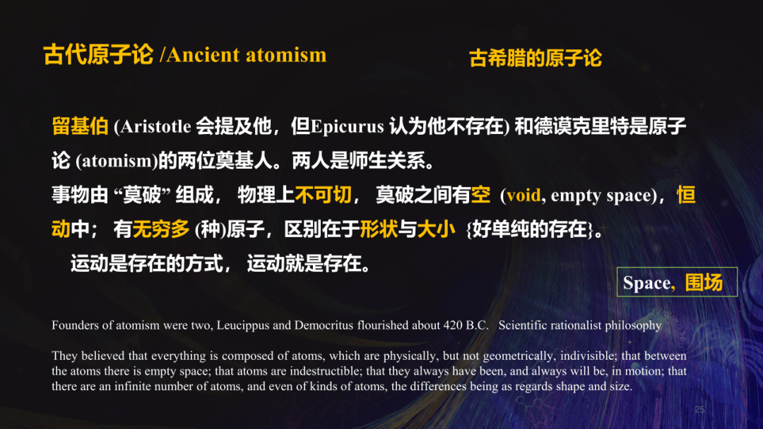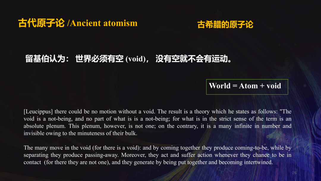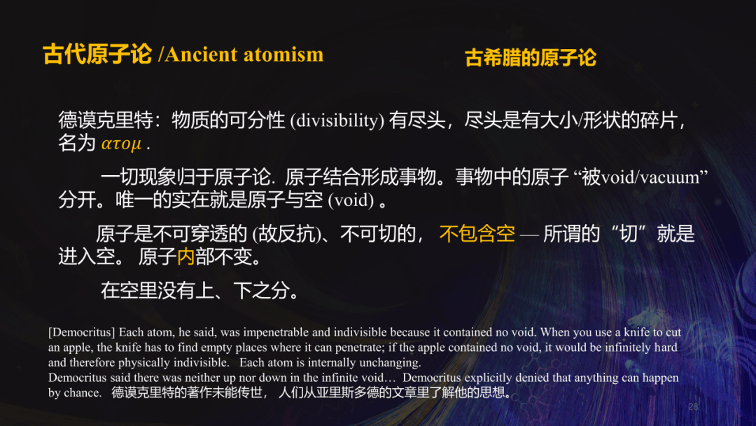 这一段总结一下,就是说跨度一两千年、也许来自不同文明的古代原子论,内容很多。有很多思想的闪光点,当然也有很多不正确的地方,因为毕竟是最原始的思想。比方说,就关于“存在=原子+原子之间这个空”,这个就引起了争论。就是有人认为,那就是原子,原子,你要谈论原子就是谈论原子,没有什么中间还有空的问题。