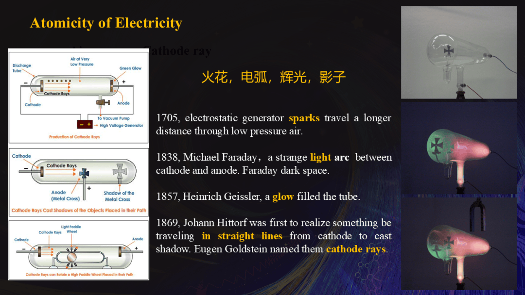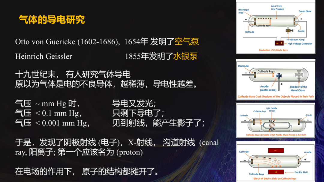 所以说,在电场的作用下,你原子结构可能就会摊开。那么这个顺序是什么呢?顺序就是玻璃管里面加上一个电极。一开始气压大,加大电压会产生火花。气压再小就会(产生)电弧,气压再小,就(会产生)辉光,到没有光的时候,会发现虽然没有光了,中间塞个东西,还有影子,就是一个火花。电弧,辉光,到没有光也有影子的一个过程,让我们发现了什么东西呢?发现了阴极射线,这时候还不叫电子,请大家记住,这时候叫阴极射线。