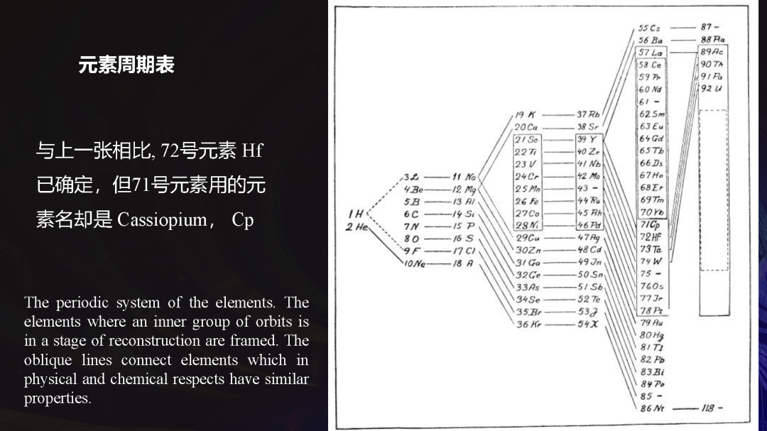比方说在锂、钠、钾这三个元素中间的间隔可能应该是差八个元素。注意到这个八度律的周期性的时候,就预言了一个元素,germanium,我们把它翻译成“锗”。这个词实际上就是日耳曼,就是德国,Germany。还有一个叫麦耶的人根据化学价态为28种元素做了分类。这些分类都不是特别成功。因为我们知道用原子质量也好,或者用价态也好,它作为序数参数都不合格,因为它们不具有唯一性。所以元素周期表的亲戚关系就乱,一时半时看不出来。