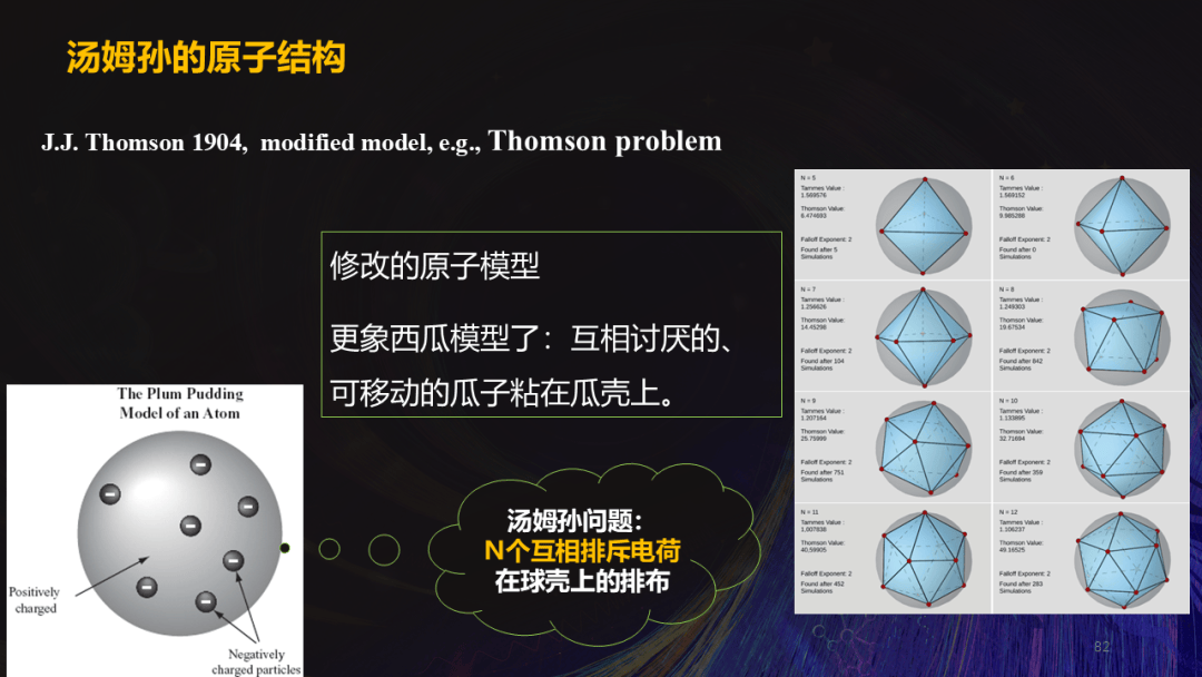 那么它应该是怎么排列呢?排列很简单,它们之间排斥的势能最小的形状就是电子的分布,于是乎,这引出了一个数学上的汤姆孙问题模型,不管是不是原子,现在假设有个导体球壳上面放上N个电荷,请问当N个电荷这个排斥势能最小的时候怎么分布?