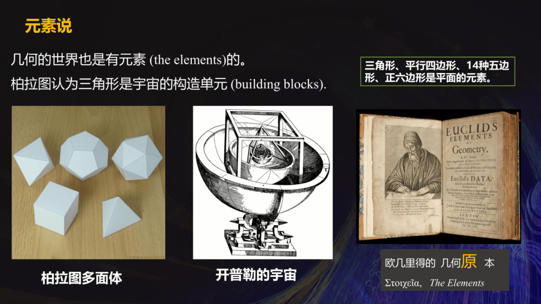 由此理解西方(尤其古希腊)重视几何学的原因:几何学与元素(elements)、原子都有关。著名的《Elements of Geometry》汉语译成“几何原本”是误解——当年老师念“几何原本”,我还疑惑难道有“几何抄本”?后来明白应是“几何原子”:几何最重要的原子是三角形,所以初中数学先学三角形。