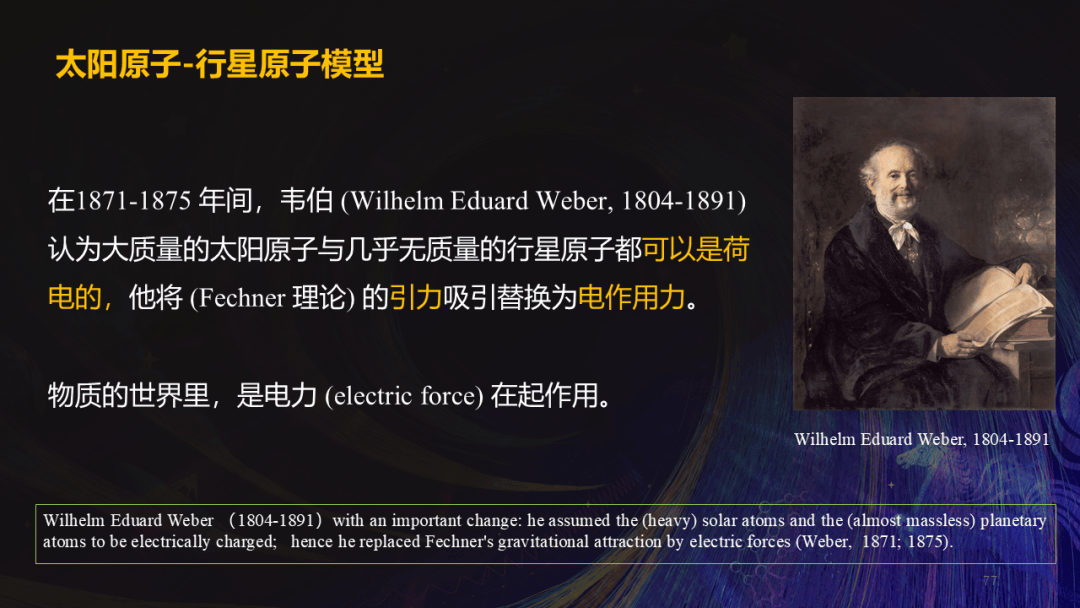 实际上,就是韦伯这位大物理学家,他认为物质应该可以参照太阳和行星的关系。即中间是太阳原子,旁边是几乎没有质量的行星原子,他们在一起凑成了物质。但是它们之间的相互作用不是万有引力,而是电相互作用力。韦伯最伟大的地方在哪儿呢?他告诉我们,在物质构成这个问题上,是电力在起作用,不是万有引力,是电力啊,这个观念非常重要。