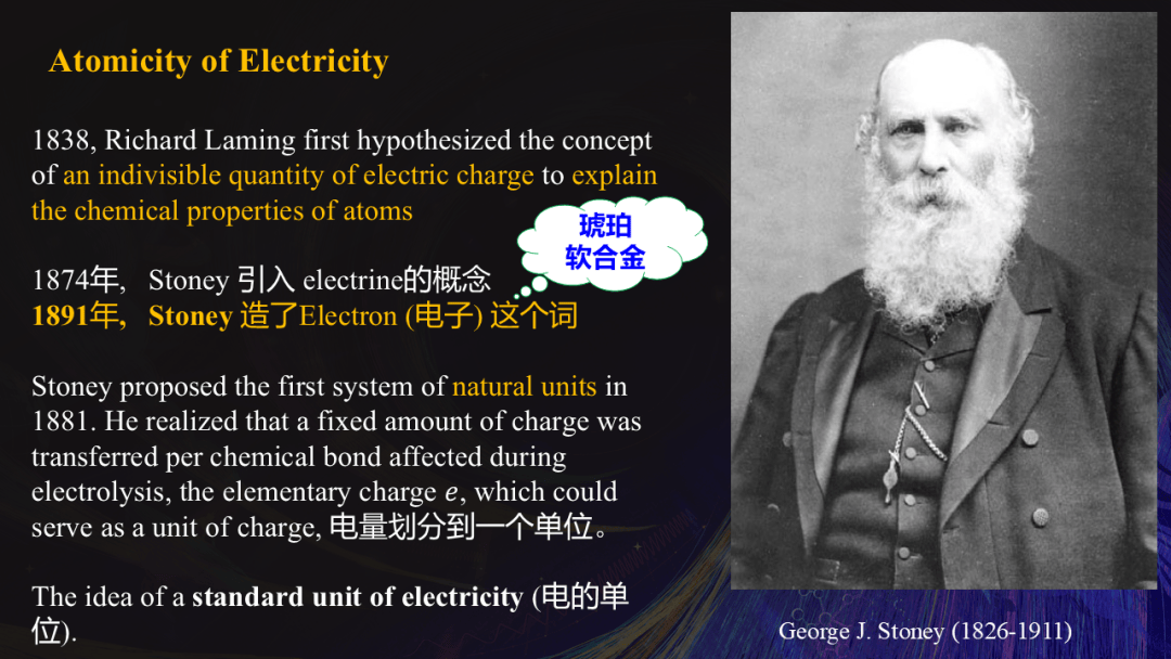 1874年的时候,Stoney给它起个名字叫electrine。1891年,又改成了Electron。但是Electron这个词本身,以前希腊语里就有,以前希腊语里就有,琥珀。或者金银、合金这种特别软的东西就叫electron啊,现在重新造这个词,Electron意思是说是导电的导电子或者导电的最小单元,是电的一个最小单位,造了electron这个词。