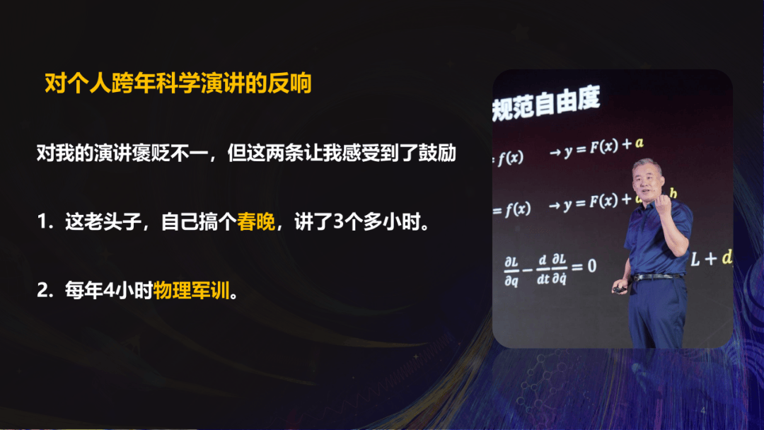 这些年,外界对我的跨年演讲褒贬不一,但有两句话让我特别感动。一条评论说:“这老头子自己搞了个春晚,讲了3个多小时。”另一条说:“每年我都要经历4小时的物理军训。”有人将我的演讲与春晚、军训这两个严肃概念联系到一起,我感到非常荣幸。