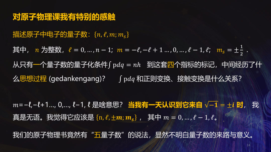 那么我自己学原子物理的时候非常困惑,比方说LS耦合、选择定则,我以为这些理论是出现在量子力学之前,后来才发现其实这些内容是出现在量子力学被提出来之后。最要命的是没人告诉我这玩意儿哪来的。更要命的是不告诉我这些东西有相当的复杂性和有限的正确性,也就是说不是特别严格成立的。我心说,当年你稍微告诉我它不是严格成立的,我也不那么困惑了。