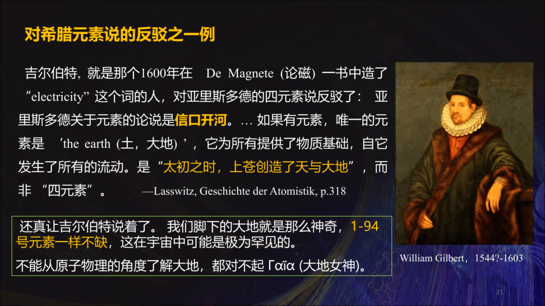 希腊元素说受驳斥,如吉尔伯特认为:若上天创造宇宙,最初只创造大地和老天,哪有什么四种元素?我觉得他说对了——上苍最重要的是创造人类脚下的大地,神奇的是这片土地竟包含1-94号所有元素。