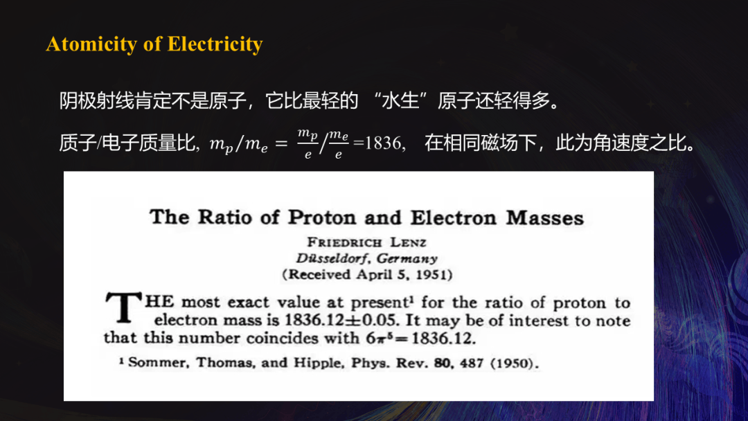阴极射线肯定不是原子,因为它的荷质比比氢原子差很多,差1800多倍,这个肯定不会弄错。因此,测量电子的荷质比,或者说测量质子和电子的质量比这个问题,一直是实验物理的一个重要研究话题。这个地方我给大家展示的是1950年的一篇论文,就是确定质子和电子的质量比,这篇论文只有一句话。请大家记住,这才是好的论文,有话就多说,比方说像索末菲的讲原子模型的,就94页,像这篇文章一句话就完了。