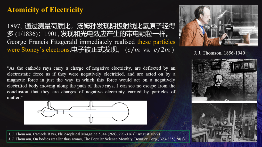 于是乎菲茨杰拉德就准确的认识到,这个东西可能就是Stoney命名的那个东西,即 电子,所以人们把1897年J·J·汤姆森测敲定荷质比,从而把阴极射线确认为电子当做电子被发现的那一年,因此,J·J·汤姆森就被称为是电子的发现者。其实,实际故事不是(这样的),早在他之前人们就发现过电子,只是那时候它不叫电子,它叫阴极射线。待会我们知道,还有另外一个场合,电子叫贝塔射线,还有别的故事。