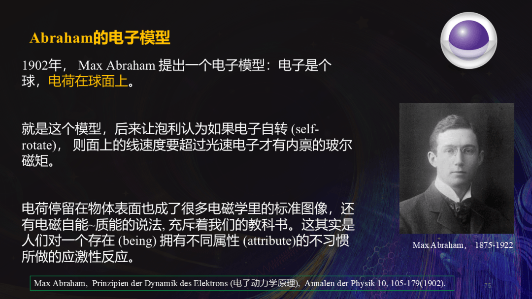 电子是什么样子?1902年有个电子模型,Abraham提出来的,说电子是个球形的,而电荷在哪儿呢?电荷在最外层的球壳上均匀分布。就像一个鸡蛋,在最外层鸡蛋壳上均匀分布的,就是电子。恰恰就是这个模型很害人啊,后来让泡利认为,如果电子自转,则线速度要超过光速,就是说电子要转动的足够快,使得它表面上线速度大于光速,它带着这些电子产生的电子磁距,才能够测量到。所以说,泡利否定了电子自旋的概念。