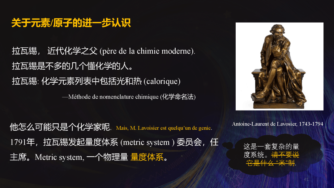 对于这个认识,有一个伟大的物理学家、化学家,就是法国人拉瓦锡。拉瓦锡被称为近代化学之父,而且他是世界上不多的几个懂化学的人。因为什么呢?他认为化学的元素列表中必须包括光和热。我觉得这一点认识非常重要。尤其我觉得我们中学老师教化学的时候一定要记住:当你谈论化学反应的时候,里面的重要角色日光和热你是不能忽略的。像他这么聪明的人不可能只是个简单的化学家。1791年他做出了一个对世界最重要的影响,就是发起了一个度量体系委员会。就是说我们的科学发展到今天,对各种物理量的测量要构造出一个科学的体系来。这一套就是今天我们国家也采用、国际上采用的叫 metric system。我们汉语随便把它翻译成“米制”,这是个非常糟糕的翻译,不对。metric system 是一套度量系统,是一套关于很多物理量的度量系统,它不是什么“米制”,而是一个度量的系统。