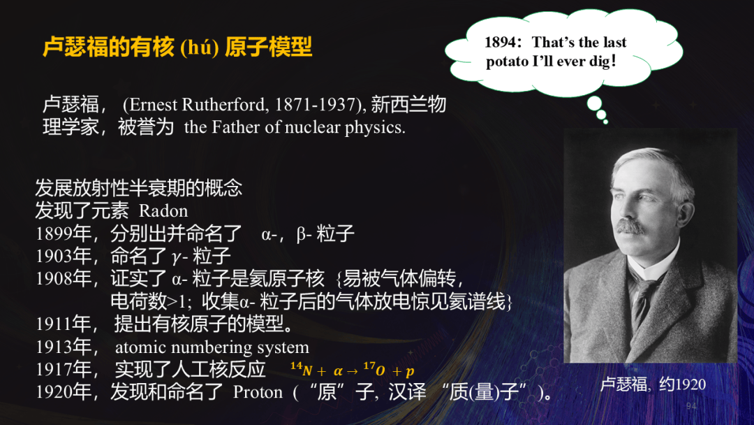 但是这位老兄是哪儿人呢?他是新西兰人,在家里也是个农民,挖土豆。当他大学毕业那天收到剑桥大学的奖学金的时候,还在地里挖土豆。据说他把手里的土豆往往一扔,说:这是我这一辈子挖的最后一个土豆了。1894年去留学,到1897年、99年的时候,就已经做出一长串的科学成就了。
