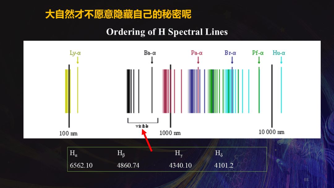 谱线很有意思,不同的物质在我们可见的范围,竟然数目不一样。比方说锂是20,钾就是41,钡163条还行,如果是铁的线条。大家想象一下啊,如果做出了一个可见光的光谱图。几十条,几百条,怎么研究啊?请找出他们之间的关系,哪儿找去?但是,老天舍不得藏住自己的奥秘。