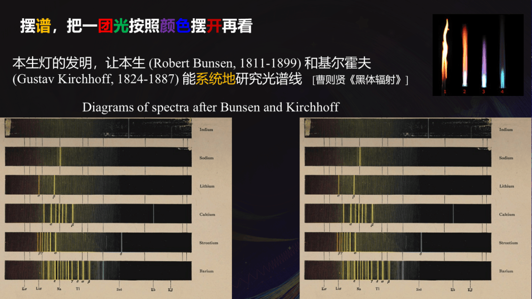 一个德国的教授,本生(Robert Bunsen,1811-1899) 发明了一种灯,就是现在有些化学实验时候用的本生灯。这个灯能就获得稳定的火苗,然后里面加上点盐,就能得出不同颜色的火苗,可以研究光谱了。当年也有照片,能拍出一些光谱线。