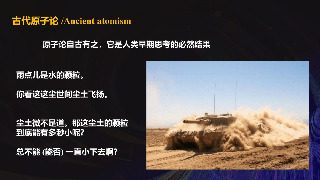 这个关于原子论,不光是西方的智者有,其实东方的智者也都早注意到。比方说印度甚至更早,印度在公元前6世纪,迦那陀就认为存在“阿努”,所谓的原子不能再分,并且明确地说它们不再能够赋予尺度。这是最重要的,不光是物理上不可分,而是当你遇到了一个不可分的时候,实际上你已经无法度量它的尺度、它的大小了,这一点的重要非常重要。就当我们的物理研究进入到一个时间或空间的极限尺度上的时候,请记住,你要同步发展如何度量的学问,因为你不知道如何度量它。
