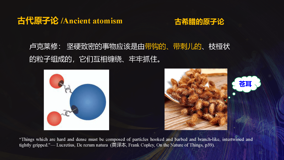 那么,卢克莱修进一步就是说拓展了这个原子论。明确地说,这个原子可能是带刺儿的,可能长得像树枝似的,它们互相缠绕、互相抓住,就形成了不同的物质。这个我觉得可能也是来自大自然的启发。我们很多人家乡都应该有这个东西叫苍耳,人或兔子从那走过以后都会沾一身,它们互相之间也会粘到一起去。