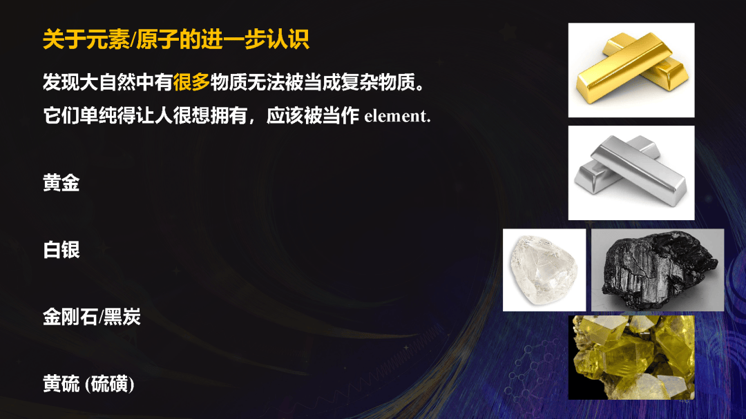 我们的大地是非常神奇的。大地有很多元素,而且很多元素用一种非常可爱的形式让你注意到。大家看,黄金、白银、黑炭。黑炭你要不喜欢,它还有兄弟白炭,白炭俗名叫金刚石。然后还有黄硫,黄硫名字叫硫磺,我们管它叫硫磺,实际上就是黄硫。这些东西都是我们这土里就有的,或者火山口里就有的现成东西。我觉得它们单纯得让人很想拥有,所以说它们是 element。请记住,element 表示它很单纯。