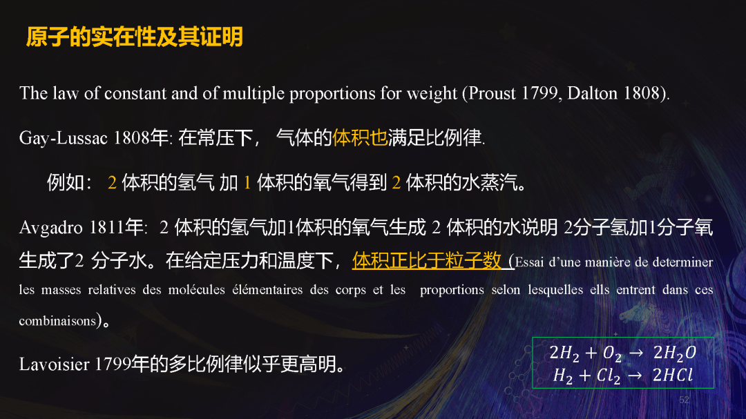 19世纪初那一段时间里,像法国的科学家盖-吕萨克也注意到,不仅是化学反应里固体物质的质量满足一定比例,如果是气体的话,气体的体积也满足一定比例。比方说两个体积的氢气加一个体积的氧气,就能得到两个体积的水蒸气。