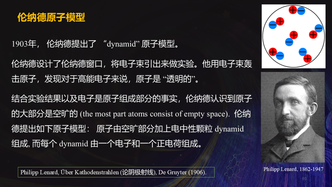 Philipp Lenard,刚才我们说把感光板买光了的那位,这位大科学家还做了一个很重要的实验,就是用电子束去轰击气体。他发现电子束稍微快一点儿,根本就不受影响,能穿过去。也就是说,原子几乎是绝大部分是空旷的,就像一个人逛街似的,街上是空旷的,你从这头走到那头,一点儿都不用偏转。