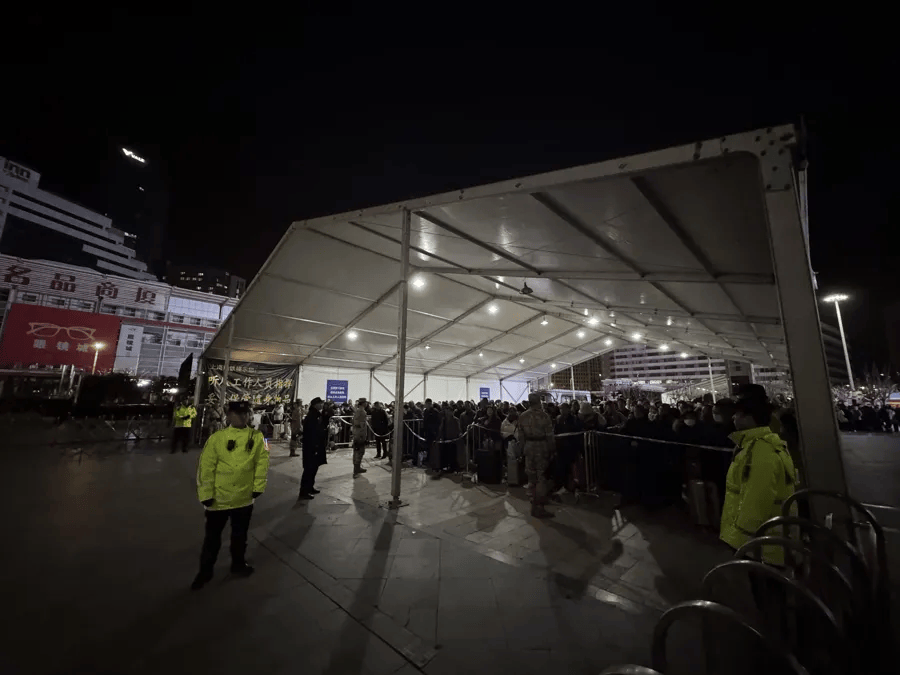 今天(2月23日)凌晨4点,在上海火车站的南广场上,一座白色的临时候车大棚格外引人注目。深夜,这为等待地铁头班车的旅客提供了庇护。站区工作人员吴炯和同事们正在引导旅客有序进入车站候车方阵,等待进站。