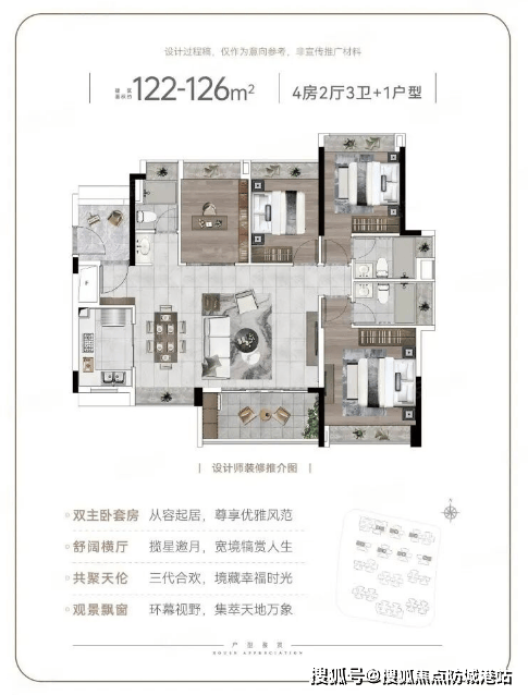 对于多代同堂的家庭,122至126平方米的4+1房是理想之选。主打双主套设计,两个主卧均带有独立卫生间,既能享受天伦之乐,又能保障各自私密空间。双主套设计是现代家庭居住的重要趋势。父母和孩子互不干扰,晚上休息互不影响,白天活动又能在公共区域交流感情。这种设计既体现了对长辈的尊重,也保护了年轻人的隐私。房间尺度舒展,每个房间都宽敞明亮,居住舒适度大幅提升。无论是三代同堂还是四代同堂,都能在这里找到合适的居住方案。