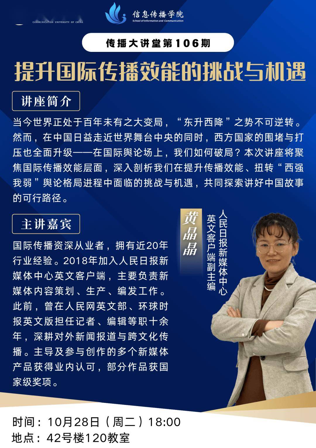 【内容】本次讲座将聚焦国际传播效能层面,深入剖析我们在提升传播效能、扭转“西强我弱”舆论格局进程中面临的挑战与机遇,共同探索讲好中国故事的可行路径