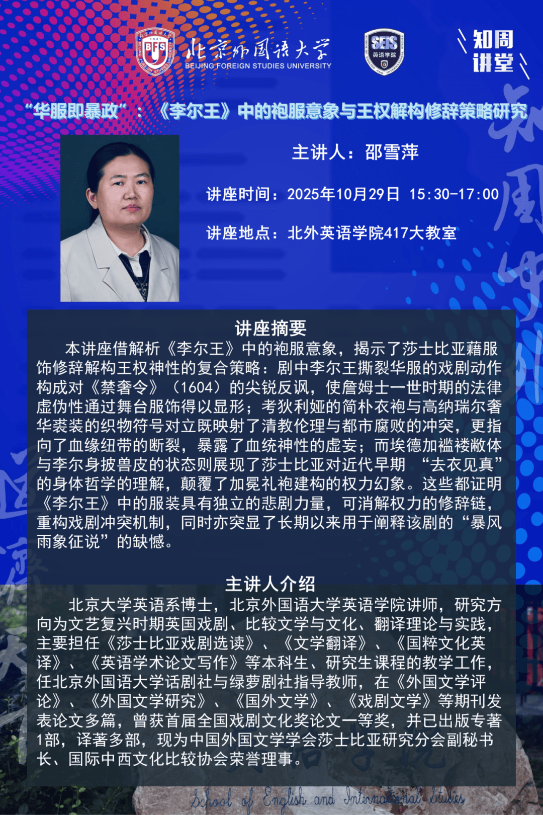 【内容】本讲座借解析《李尔王》中的袍服意象,揭示了莎士比亚藉服饰修辞解构王权神性的复合策略:剧中李尔王撕裂华服的戏剧动作构成对《禁奢令》(1604)的尖锐反讽,使詹姆士一世时期的法律虚伪性通过舞台服饰得以显形