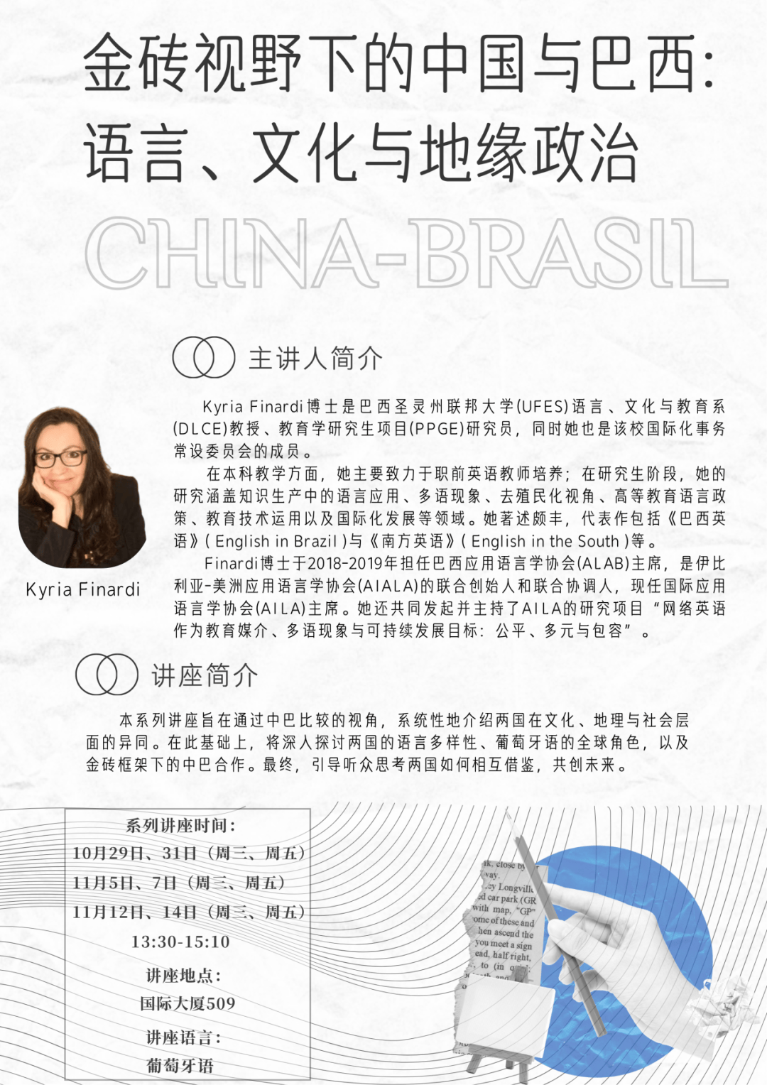 【内容】本系列讲座旨在通过中巴比较的视角,系统性地介绍两国在文化、地理与社会层面的异同。在此基础上,将深入探讨两国的语言多样性、葡萄牙语的全球角色,以及金砖框架下的中巴合作。最终,引导听众思考两国如何相互借鉴,共创未来