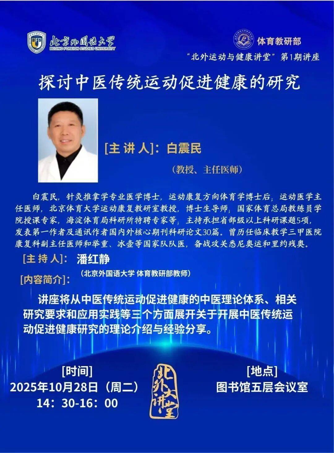 【内容】讲座将从中医传统运动促进健康的中医理论体系、相关研究要求和应用实践等三个方面展开关于开展中医传统运动促进健康研究的理论介绍与经验分享