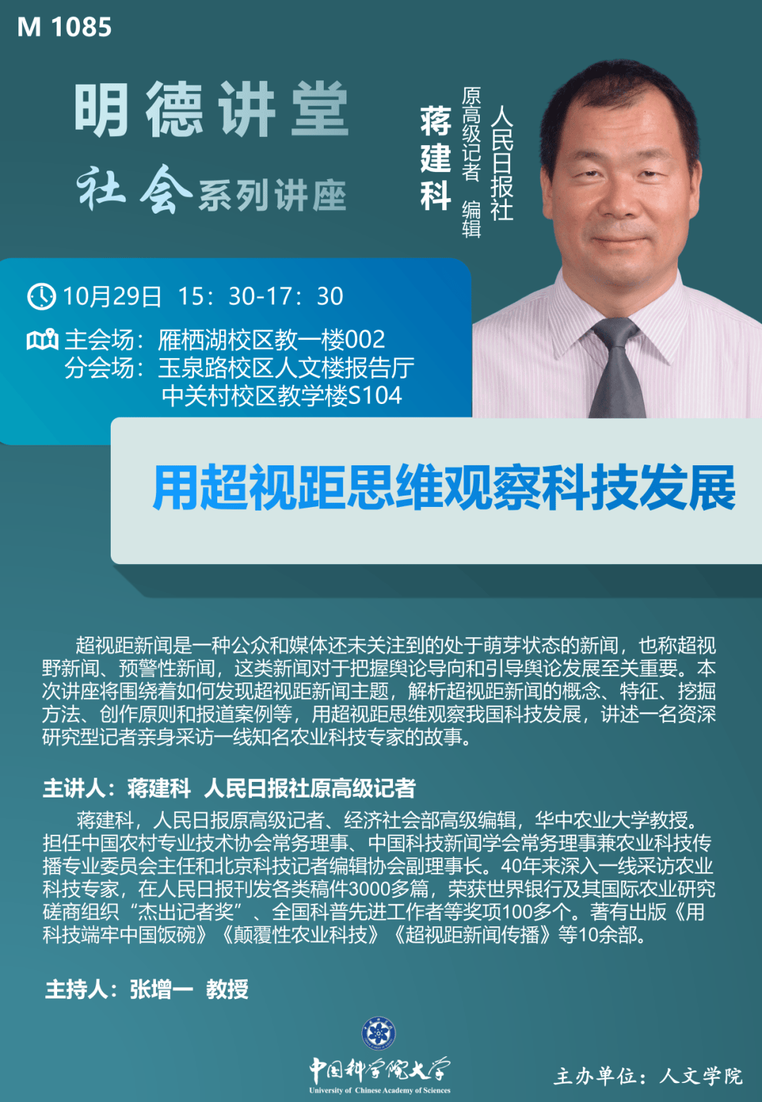 【内容】本次讲座将围绕着如何发现超视距新闻主题,解析超视距新闻的概念、特征、挖掘方法、创作原则和报道案例等,用超视距思维观察我国科技发展,讲述一名资深研究型记者亲身采访一线知名农业科技专家的故事。